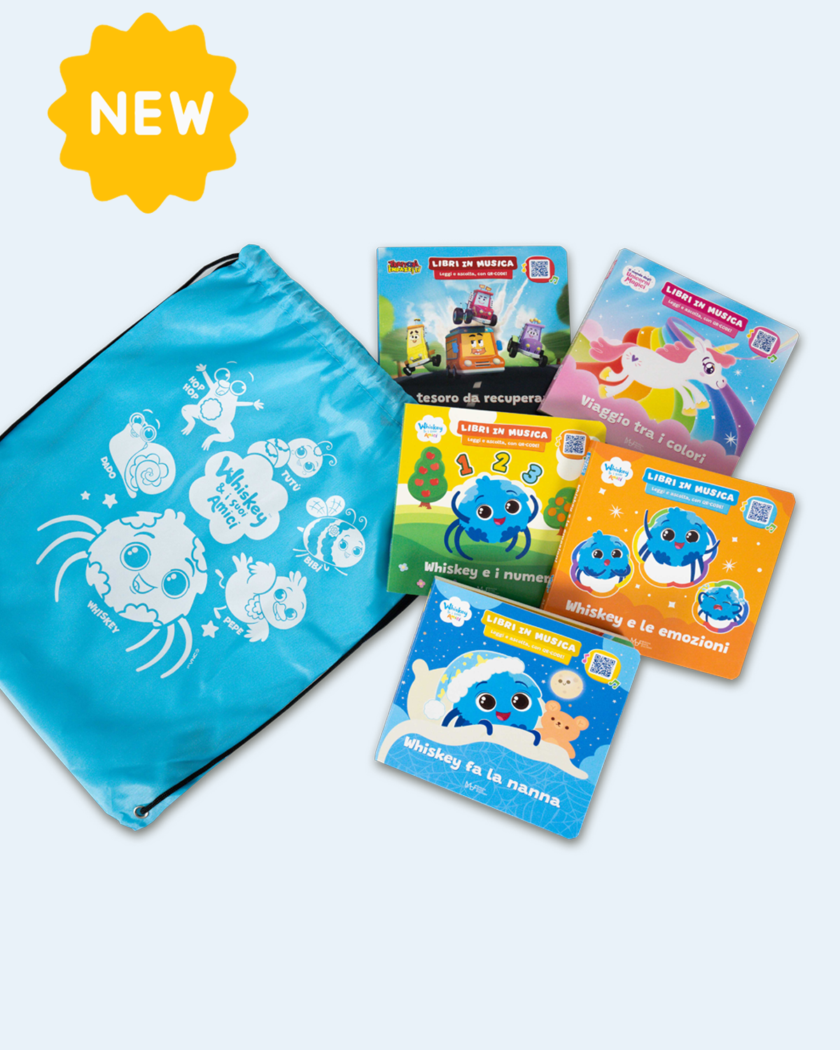 Con lo zainetto di Whiskey il Ragnetto in omaggio, porta a casa tutto il mondo una confezione speciale di 5 libri musicali interattivi.