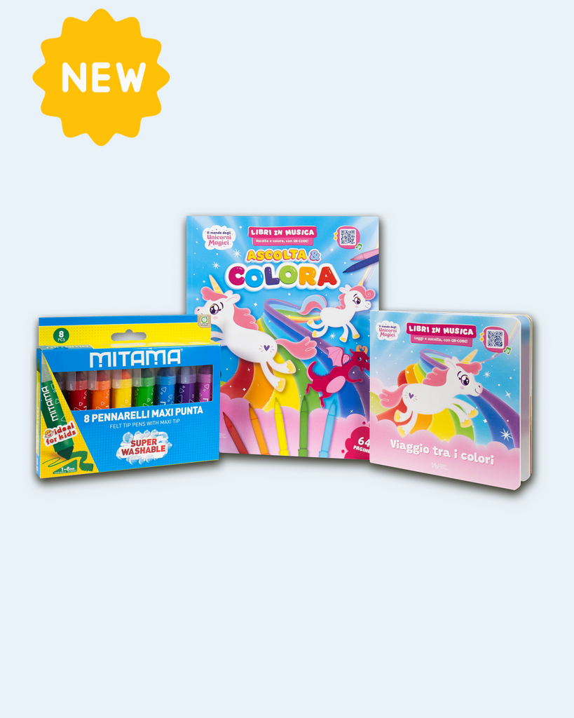 Entra nel magico mondo degli unicorni con questa confezione speciale che unisce lettura, musica e creatività! 🦄🎶